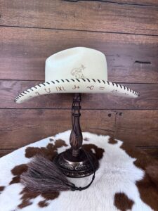 Has lady bronc rider on the side with brands all around the bottom edge of brim